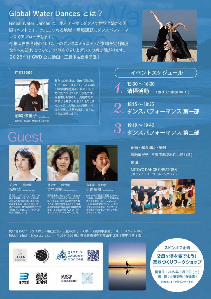 Global Water Dance(グローバルウォーターダンス)は、世界各地のダンスコミュニティがそれぞれの地域の水にまつわる環境課題と向き合い、同日にパフォーマンスを行う国際ダンスイベントです。今回、中四国では初めて、MITOYO DANCE CREATORS!が日本から参加します。
